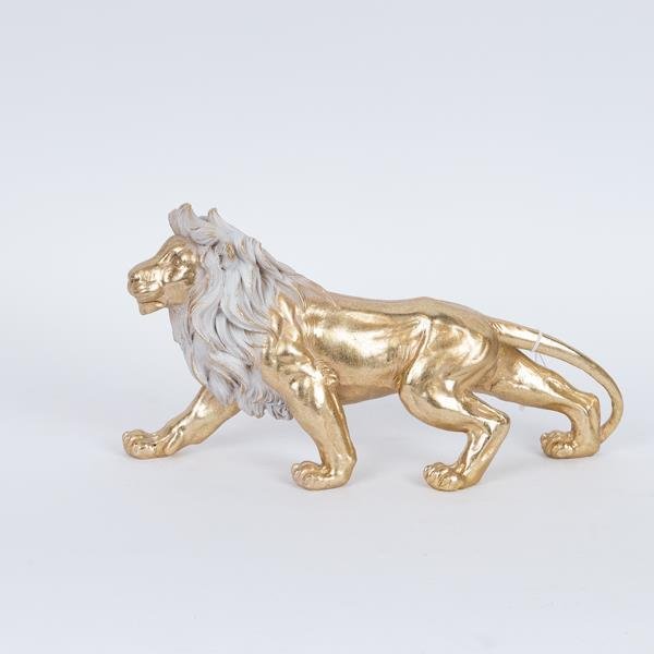 Χρυσό διακοσμητικό λιοντάρι σε κίνηση 30×8.5x16cm κεραμικό με ανάγλυφες λεπτομέρειες.