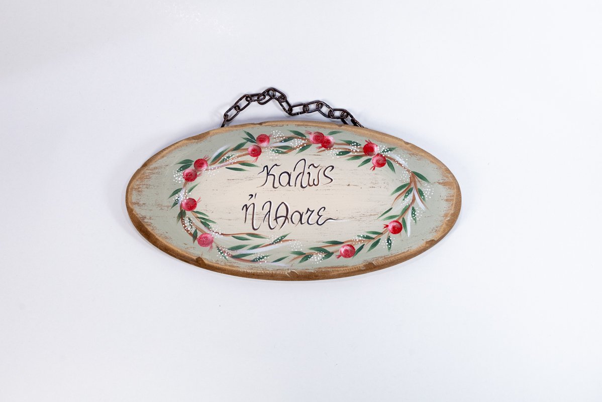 Οι επιγραφές μας κατασκευάζονται από φυσικό ξύλο, διατηρώντας τη ζεστασιά και τη μοναδική υφή του υλικού. Το κάθε κομμάτι βάφεται και διακοσμείται στο χέρι, με παραδοσιακά μοτίβα εμπνευσμένα από την ελληνική φύση — όπως κλαδιά ελιάς, άνθη και γήινες αποχρώσεις που αποπνέουν αρμονία και διαχρονικότητα. Η καλλιγραφία δημιουργείται με προσοχή και καλλιτεχνική φροντίδα, χαρίζοντας σε κάθε επιγραφή ξεχωριστό χαρακτήρα.