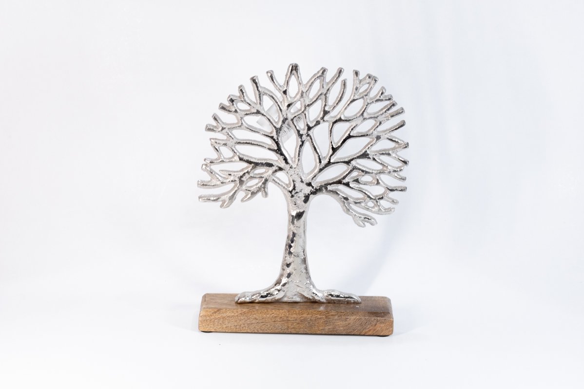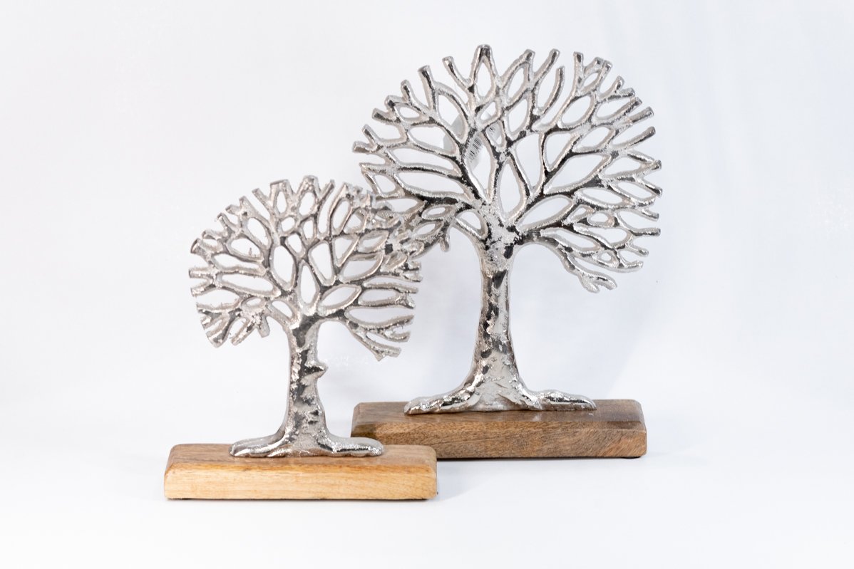 Η σταθερή ξύλινη βάση σε φυσική απόχρωση προσφέρει ισορροπία και ζεστασιά στο σύνολο, δημιουργώντας μια όμορφη αντίθεση με τη μεταλλική υφή του δέντρου. Ο συνδυασμός ξύλου και μετάλλου χαρίζει ένα αποτέλεσμα που ενσωματώνεται εύκολα σε διαφορετικά στυλ διακόσμησης, όπως μοντέρνο, minimal, rustic ή ακόμη και industrial. Είναι ιδανικό για το σαλόνι, το γραφείο, την είσοδο ή το υπνοδωμάτιο, προσθέτοντας έναν διακριτικό αλλά ξεχωριστό χαρακτήρα.