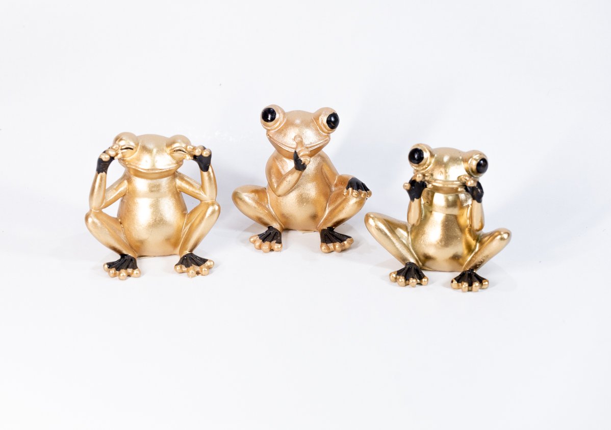 Το διακοσμητικό Σετ «Τρία Σοφά Βατραχάκια» , είναι μια παιχνιδιάρικη και ταυτόχρονα κομψή πρόταση που φέρνει θετική διάθεση σε κάθε χώρο. Εμπνευσμένο από το διαχρονικό μήνυμα «Δεν βλέπω, δεν ακούω, δεν μιλώ το κακό», το σετ αποτυπώνει τρεις χαριτωμένες φιγούρες βατράχων σε αντίστοιχες στάσεις, συμβολίζοντας την αισιοδοξία και την απομάκρυνση από την αρνητικότητα.